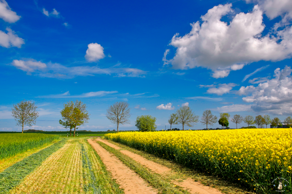Idyllische Rapsblüte in weiter Landschaft auf der Insel Poel